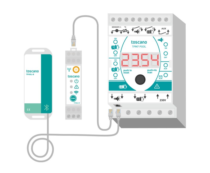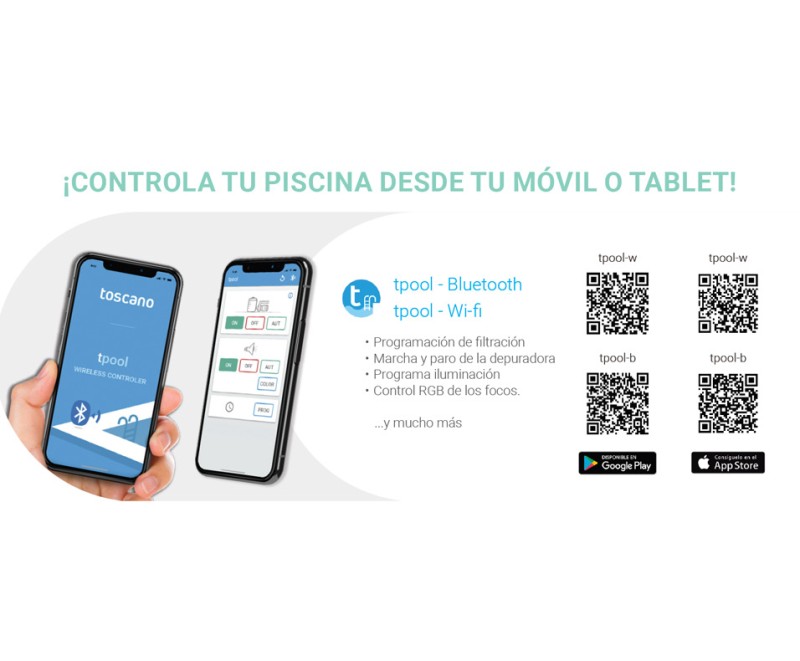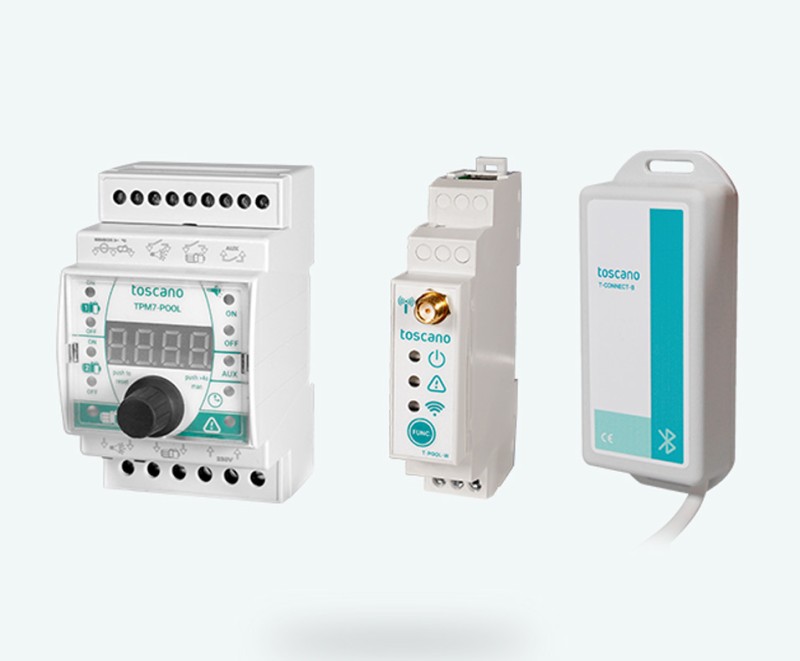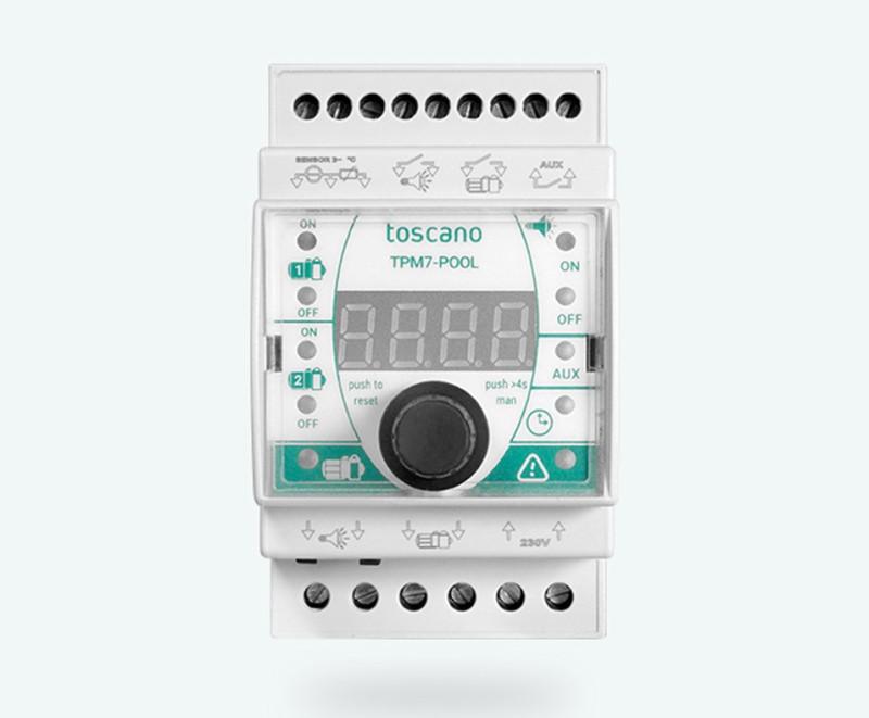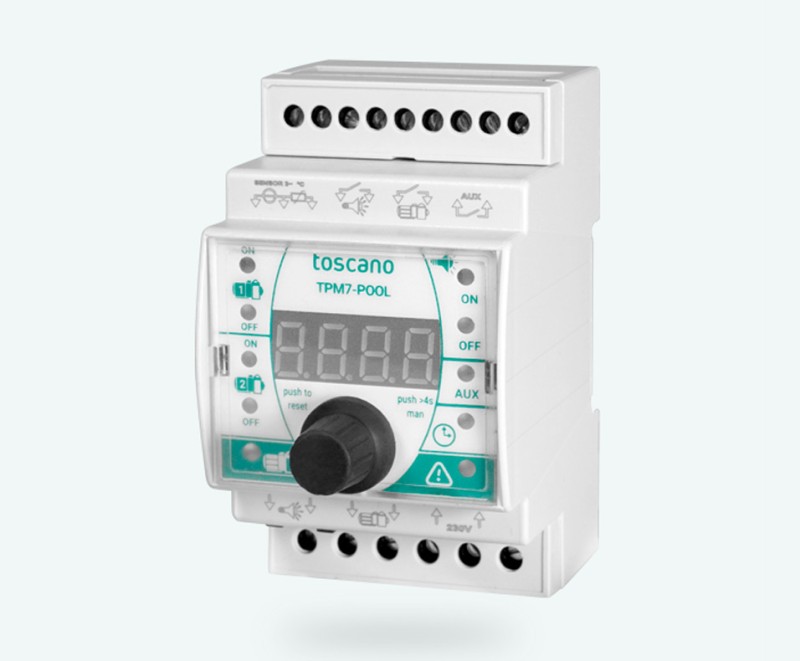 El TPM7-POOL es un relé electrónico de protección y control para depuradoras de piscinas. Integra protecciones contra sobrecarga, bajacarga y fallo de fase. En la parte de control cuenta con un reloj digital con posibilidad de programar dos periodos de filtrado. También incluye salida para programar el horario de encendido de focos. Integra un display digital para visualizar los datos de funcionamiento del equipo (hora actual, consumo de la bomba, alarmas, etc.), así como configurar las horas de filtrado y de encendido de focos. Además, incluye un conector para los módulos de comunicación TPOOL-B y TPOOL-W, comunicación Bluetooth y Wifi respectivamente. Cuanta con una App (IOS y Android) para controlar y configurar la depuradora a distancia.
